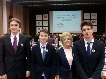 V dňoch 20. – 21.11.2019 sa uskutočnilo finále Dejepisnej súťaže českých a slovenských gymnázií v Chebe. Zúčastnilo sa ho 75 družstiev z oboch republík. Našu školu reprezentovali Tomáš Chovančák (IV.A), Martin Mikluš (III.C) a Adam Čabrák (II.A). V silnej konkurencii obsadili vynikajúce III. miesto. SRDEČNE BLAHOŽELÁME!